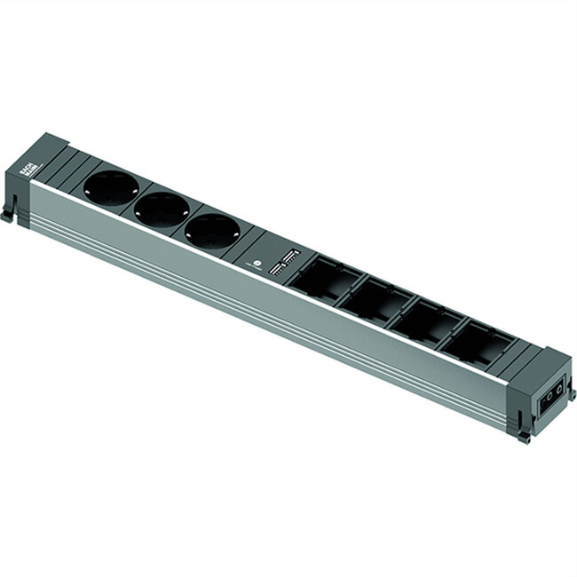 - Lengte: 444 mm met verhoogde aanraakbeveiliging- 3x stopcontact met randaarde, zwart- 1x USB dubbele oplader 5V DC / 3.1A- 4x aangepaste modules leeg,- stroomingang en -uitgang GST18- verpakt in kartonnen doos