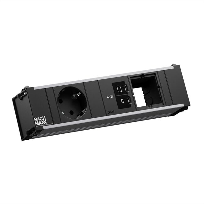 CONI Steckdosenleiste, Länge: Small ca.217mm, 1xCEE7/3 35° Steckdose schwarz, mit erhöhtem Berührungsschutz, 1xUSB C/C 45W, 1xCustom Modul leer, Stromeingang: 0,2m H05VV-F 3G1,5mm² schwarz mit Installationssteckverbinder, mit BACHMANN Logo, verpackt im Karton