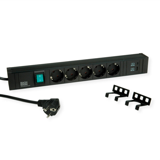CONNECT LINE kunststof zwart, 5xbeschermende contactdozen zwart 1x schakelaar, 1xUSB A/C 22W Oplader heraansluitbaar, 2,0m H05VV-F 3G1,50mm² zwart, met beschermcontact haakse stekker, met Bachmann logo, incl. montagebeugel verpakt in kartonnen doos
