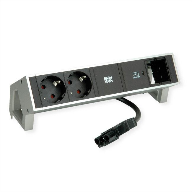 DESK2 ALU stekkerdoos INOX met verhoogde aanraakbeveiliging 2xbeschermende contactdozen zwart 1xUSB C 30W Oplader 1xcustom module leeg Voedingskabel 0,2m H05VV-F3G1,5mm² zwart met GST18 stekker incl. montagebeugel met Bachmann logo verpakt in een kartonnen doos