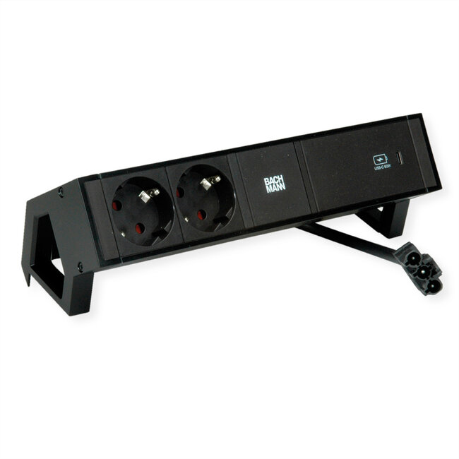 DESK2 ALU stekkerdoos kleur zwart, gelijk aan RAL9005 met verbeterde aanrakingsbeveiliging 2xbeschermende contactdozen zwart 1xUSB C 60W Voedingskabel lader 0,2m H05VV-F3G1,5mm² zwart met GST18 stekker incl. montagebeugel met Bachmann logo verpakt in doos