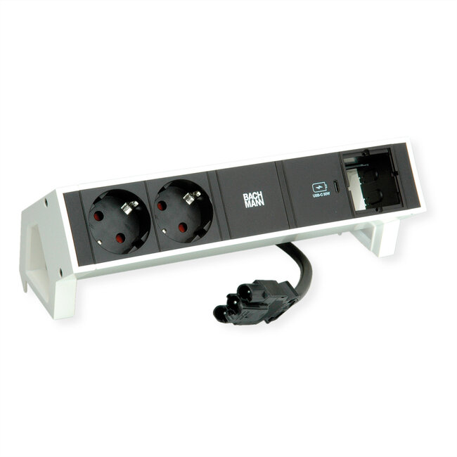 DESK2 ALU stekkerdoos kleur wit, overeenkomstig RAL9010 met verhoogde aanrakingsveiligheid 2xbeschermende contactdozen zwart 1xUSB C 30W Charger 1xCustom module leeg voedingskabel 0,2m H05VV-F3G1,5mm² zwart met GST18 stekker incl. montagebeugel met Bachmann logo verpakt in doos
