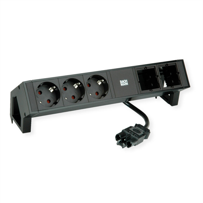 DESK 2 stekkerdoos Kleur: Zwart, zoals RAL9005 gelakt 3x veiligheidscontactdozen 35° zwart met verhoogde aanraakbeveiliging, 2x maatwerkmodules leeg Voedingskabel: 0,2m H05VV-F 3G1,5mm² zwart, met GST18 stekker, met Bachmann logo, incl. montagebeugel, verpakt in kartonnen doos.
