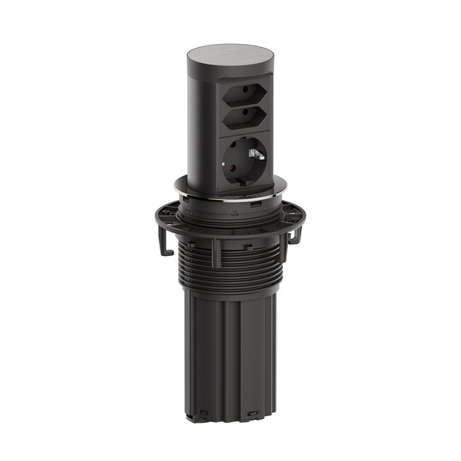 ELEVATOR 2, Herausfahrbare Steckdoseneinheit, Edelstahl-Optik, 1xSchutzkontaktsteckdose schwarz, mit erhöhtem Berührungsschutz, 2x Euro-Steckdosen schwarz, Zuleitung 2,0m H05VV-F 3G1,5mm² schwarz, mit Aderendhülsen und beigelegtem Schutzkontakt-Montagestecker, verpackt im Karton.