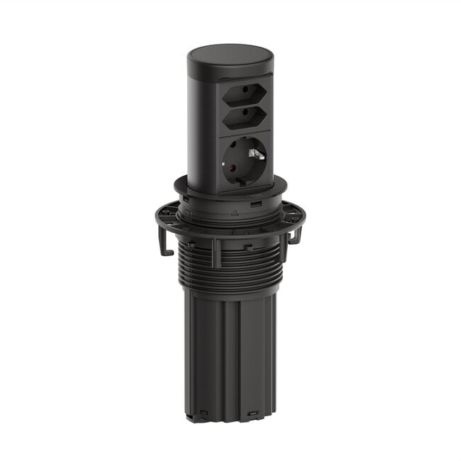 ELEVATOR 2, Herausfahrbare Steckdoseneinheit, schwarz matt ähnlich RAL 9005, 1xSchutzkontaktsteckdose schwarz, mit erhöhtem Berührungsschutz, 2x Euro-Steckdosen schwarz, Zuleitung 2,0m H05VV-F 3G1,5mm² schwarz, mit Aderendhülsen und beigelegtem Schutzkontakt-Montagestecker, verpackt im Karton.