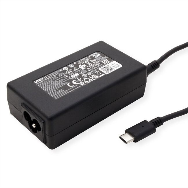 Oplaadadadapter USB-PD 65W met USB Type-C stekker en kabelwartel 1,5m Ingang: AC 100V-240V~/1,5A /50/60Hz Uitgang Type-C 5V~3A / 9V~3A 12V~3A / 15V~3A / 20V~3,25A zwart verpakt in doos