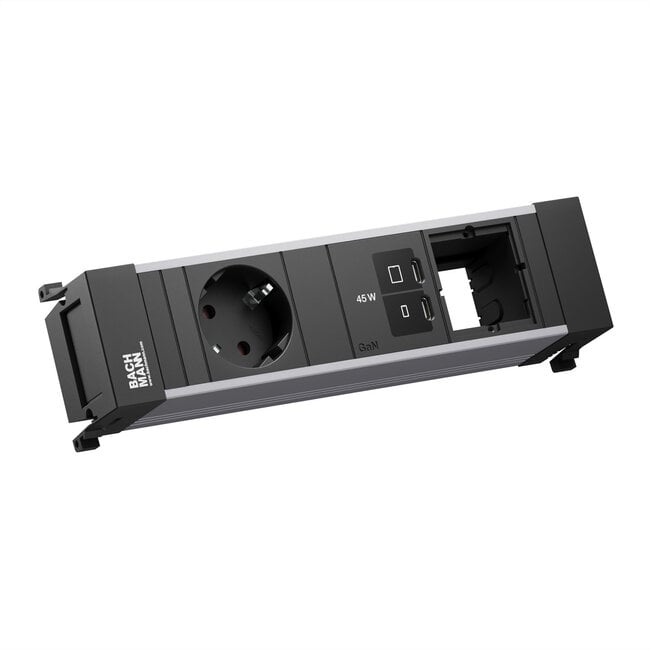 POWER FRAME Steckdosenleiste, Länge: Small ca.220mm, 1x CEE7/3 35° Steckdose schwarz, mit erhöhtem Berührungsschutz, 1xUSB C/C 45W, 1xCustom Modul leer, Stromeingang 0,2m H05VV-F3G1,5mm² mit Installationssteckverbinder, mit BACHMANN Logo, verpackt im Karton