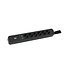 PRIMO 2 stekkerdoos Aluminium profiel zwart geanodiseerd 6xCEE7/3 stekkerdozen+ 1x overspanningsbeveiliging Zwarte design eindkappen met lus om op te hangen Voedingskabel: 2,0m H05VV-F 3G 1,5mm² zwart met haakse veiligheidsstekker met BACHMANN logo verpakt in doos