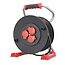 Professionele kabelhaspel Haspellichaam van robuuste, zeer breukvaste speciale kunststof 3x veiligheidscontactdozen incl. klapdeksel IP44 25,0m rubberen slangkabel H07RN-F 3G 1,5mm² met veiligheidscontactstekker CEE7/7 Robuust, schokabsorberend professioneel dubbelbuisframe met stergreeprem Ergonomische, slipvaste 2-componenten handgreep Geïntegreerde kabelgeleiding Incl. thermische beveiligingsschakelaar Voor buitengebruik en op bouwplaatsen Verpakt in kartonnen doos