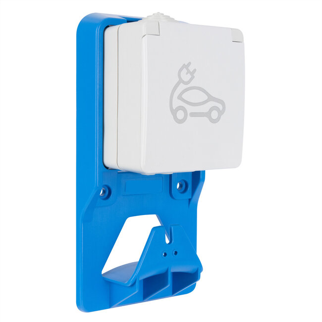 Autoladesteckdose (CEE7/3), Serie 9014, 16A, 250V, mit veredelten Kontakten, mit zusätzlichem Berührungsschutz, ermöglicht sicheres Laden in Mod1 oder Mod2, Schraubkontakte IK08, inkl. Kabelaufhängung, Aufputz-Ausführung, IP65, Steckdose lichtgrau ähnlich RAL 7035, Kabelaufhängung himmelblau ähnlich RAL 5015
