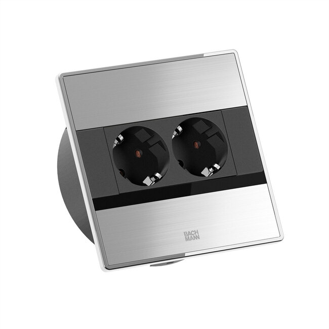SENSE Einbau-Steckdose, Edelstahl-Optik, 2xSchutzkontaktsteckdosen mit erhöhtem Berührungsschutz, Zuleitung 2,0m H05VV-F3G1,5mm² schwarz mit Aderendhülsen und beigelegtem Schutzkontakt-Montagestecker, verpackt im Karton.
