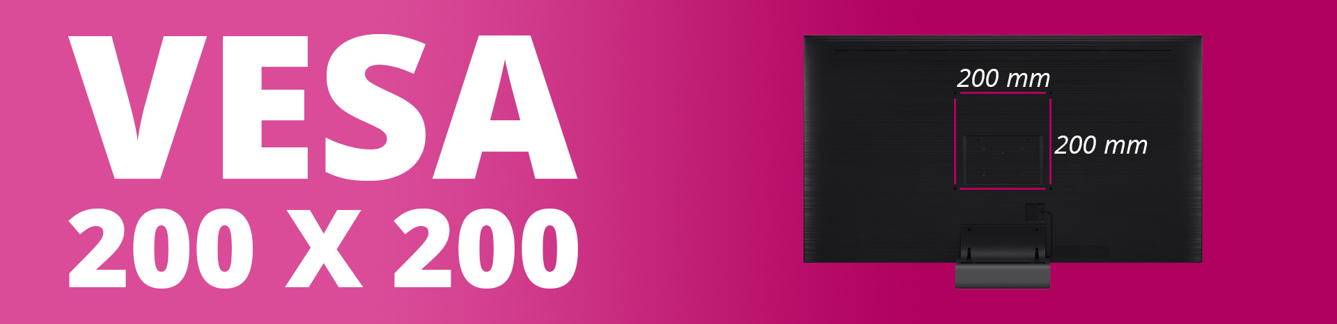 Meet de breedte en de hoogte van de schroefgaten op. Wanneer de afstand tussen de schroefgaten 100 mm is spreken we over VESA 100. Soms komt het voor dat breedte 400 mm betreft en de lengte 200. De VESA maat is dan 400/200. De televisie in het voorbeeld hieronder beschikt over VESA 200.