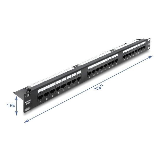 The 19″ patch panel (1U) with 24 Cat.6 RJ45 ports by Delock serves as a central distribution point for structured network cabling. The cables are securely connected via LSA connectors on the rear, while the robust metal housing ensures stability in the network cabinet.