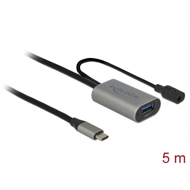This active USB cable by Delock can be used to extend a USB connection by 5 m. The cable has an additional DC power socket to which an optional power supply can be connected. This ensures optimum data transmission even when used with powerful devices such as a 2.5″ hard drive.
