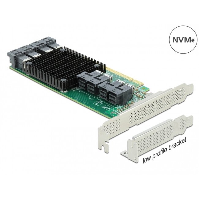 This PCI Express card by Delock expands the PC by eight SFF-8643 interfaces. SSDs with e.g. U.2 interface can be connected to these ports by using an optional cable.