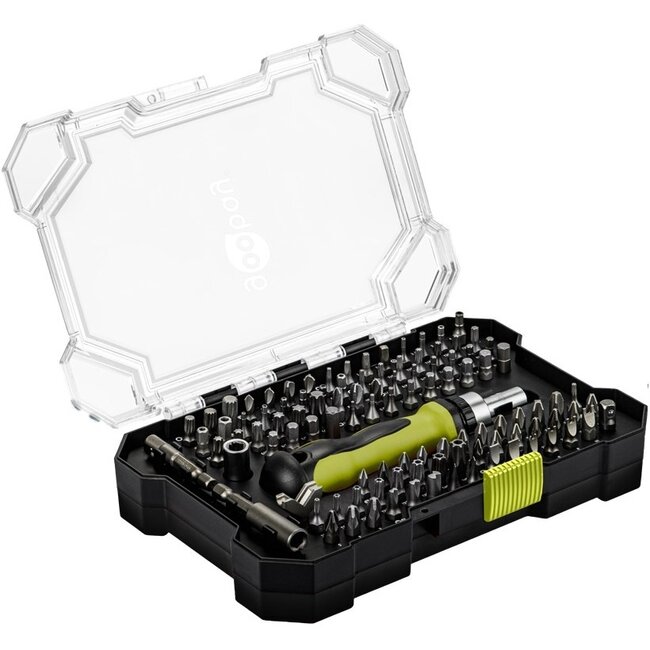 - set bevat 99 bits van schokbestendig S2-staal en een schroevendraaier met ratelfunctie