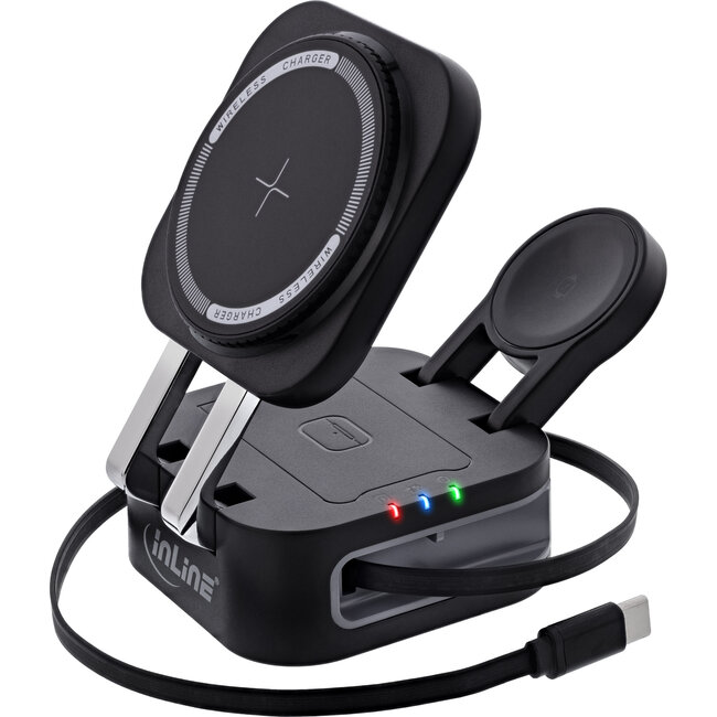 De InLine 3-in-1 draadloze oplader is de perfecte draadloze oplaadoplossing voor alle Apple-fans. Laad tegelijkertijd uw iPhone, Apple Watch en AirPods op – zonder kabelwarboel. Het magnetische oplaadoppervlak voor smartphones is compatibel met MagSafe en zorgt voor veilig en nauwkeurig opladen. Zelfs bij gebruik van een beschermhoes met een materiaaldikte tot 5 mm blijft de oplaadfunctie betrouwbaar.