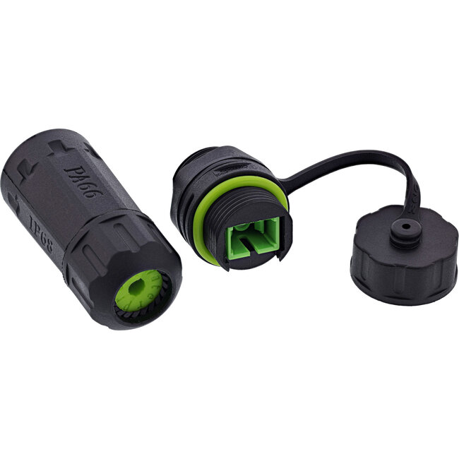 De koppeling is uitgerust met twee SC Simplex-bussen en is geschikt voor singlemode-verbindingen met UPC- of APC-slijping. Dankzij beschermingsklasse IP68 is hij betrouwbaar beschermd tegen water, stof en temperatuurschommelingen van -40 °C tot +85 °C. De behuizing is gemaakt van duurzaam nylon (PA66) en voorzien van een siliconenafdichting voor een betrouwbare afdichting.