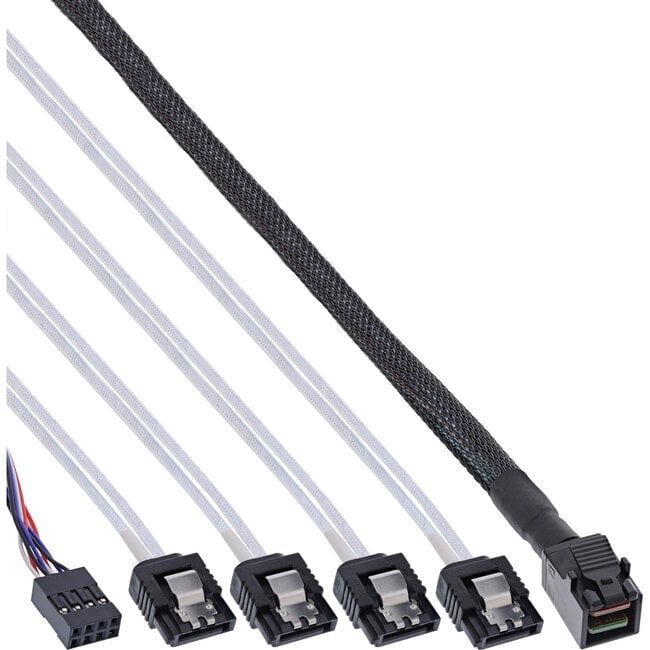 - Mini SAS HD-connector (SFF-8643) naar 4x SATA-connector + zijbandconnector