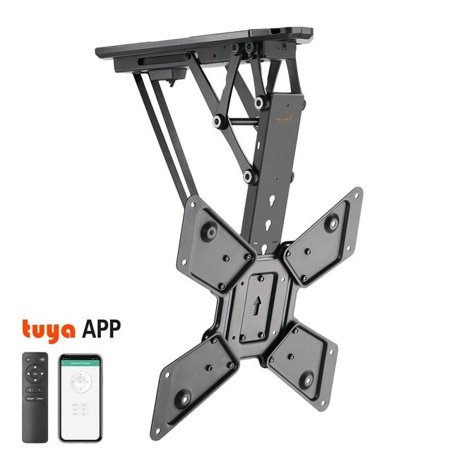 Universele gemotoriseerde plafondsteun voor flatscreen TV's en monitoren. De beugel is gemaakt van robuuste en sterke materialen waarmee u uw scherm stevig aan het plafond bevestigd. Met deze ophangbeugel kunt u het scherm uitklappen, maar ook weer inklappen tegen uw plafond. Dankzij de geïntegreerde motor kunt u deze beugel bedienen via de meegeleverde afstandsbediening of via de (gratis) Tuya app.