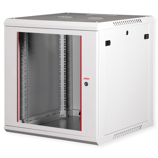 De wandbehuizingen uit de ROLINE Basic Plus serie zijn speciaal ontworpen voor flexibele netwerkbekabeling. Deze serie vormt een ideale balans tussen de ROLINE PRO en ROLINE Basic serie. De bodemplaat en het dak zijn voorzien van een gestanste kabelinvoer. Bovendien kan in het dak een ventilatormodule worden geplaatst. Binnenin zijn twee paar gegalvaniseerde profielrails met hoogte-eenheden van 483 mm (19") geïnstalleerd, die ook in diepte verstelbaar zijn. De robuuste stalen constructies van de kasten zijn gemaakt van sterk plaatstaal en zijn verkrijgbaar met poedercoating in grijs (RAL 7035) of zwart (RAL 9005). De zijpanelen zijn voorzien van een snelsluiting en zijn afneembaar, wat de toegankelijkheid verbetert. Een optioneel slot kan ook in de zijpanelen worden geïnstalleerd. Wandmontage gebeurt in twee eenvoudige stappen: Eerst wordt het achterpaneel vastgeschroefd aan de muur en vervolgens verbonden met de behuizing. Optionele stelvoeten of wielen kunnen worden gebruikt om de kasten vrijstaand te maken.