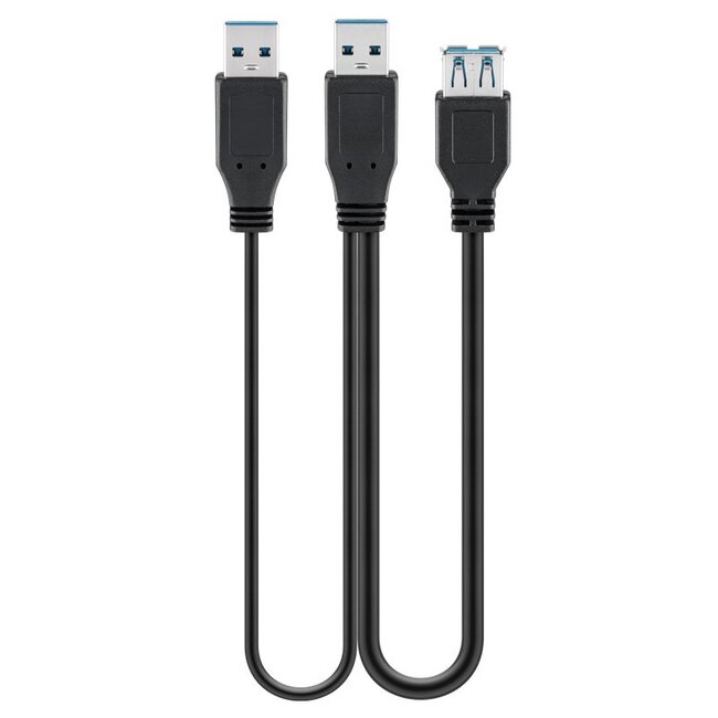Deze kabel beschikt over 2 USB connectoren aan 1 zijde. De extra USB connector levert extra stroom zodat bijvoorbeeld een externe harde schijf extra voeding ontvangt van een 2e USB poort. Hierdoor is soms een externe 5V voedingsadapter niet meer nodig.